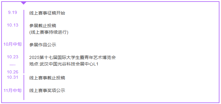 10月13日截止征集線下參展作品投稿。屆時將從階段投稿作品中評選出 TOP20 優(yōu)秀作品登上 2025 第十七屆國際大學(xué)生暨青年藝術(shù)博覽會「潮」前展區(qū)-萬興科技展廳展出。入選作者可獲得 :