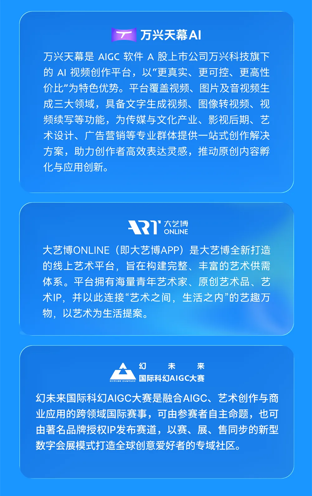 萬興天幕聯(lián)合大藝博發(fā)起“全民AI藝術(shù)創(chuàng)作大賽”并在2025幻未來國際科幻AIGC大賽中呈現(xiàn)。我們誠摯邀請您的參與,通過視頻/畫作作品一同探索AI與藝術(shù)的邊界。