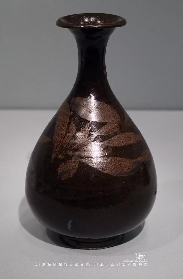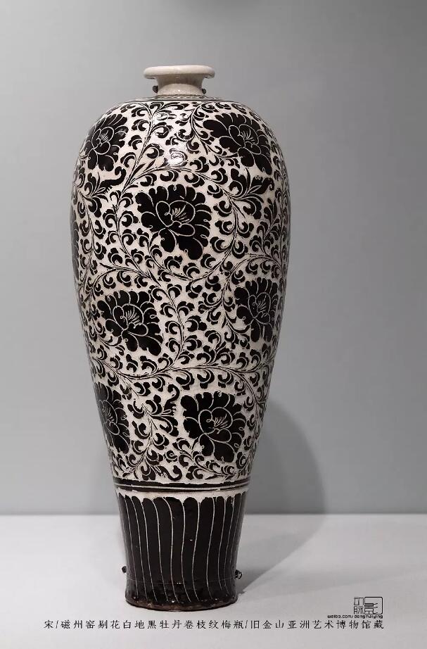 《磁州窯剔花白地黑牡丹卷枝紋梅瓶》